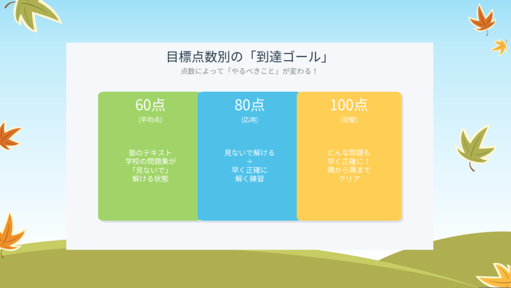 平均点を取るレベルであれば、スピードと正確性よりも「理解した、できる」のレベルを目指すので、