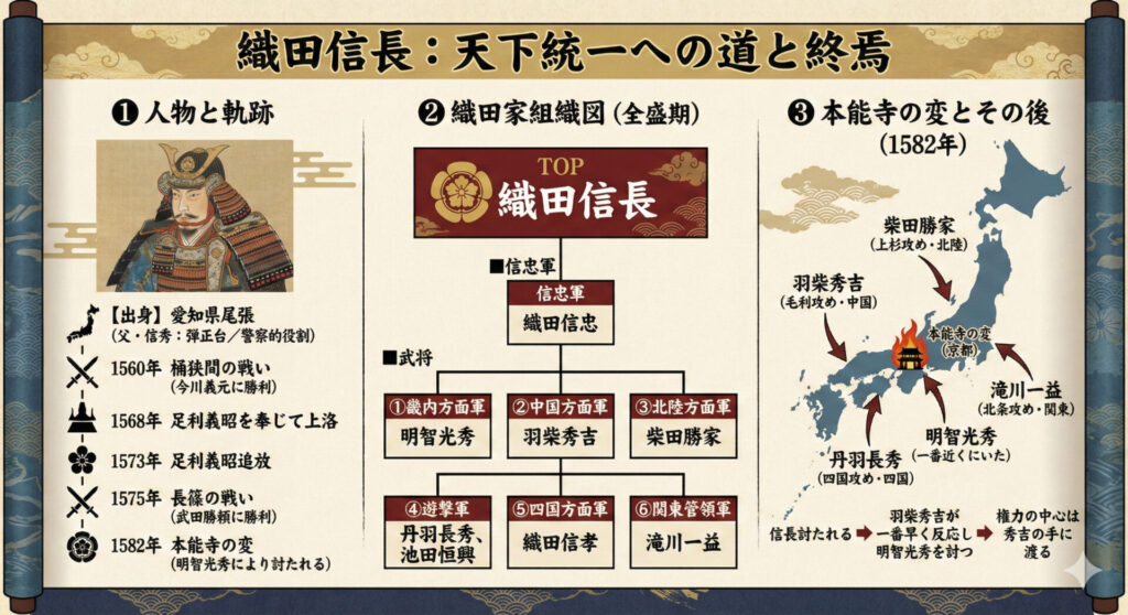 1560年に桶狭間の戦いで今川義元に勝利。1568年に将軍の足利義昭を奉じて上洛。1573年に足利義昭を京都から追放。1575年には長篠の戦いにて、武田勝頼に勝利。天下統一に向けて着実に領土を広げた。