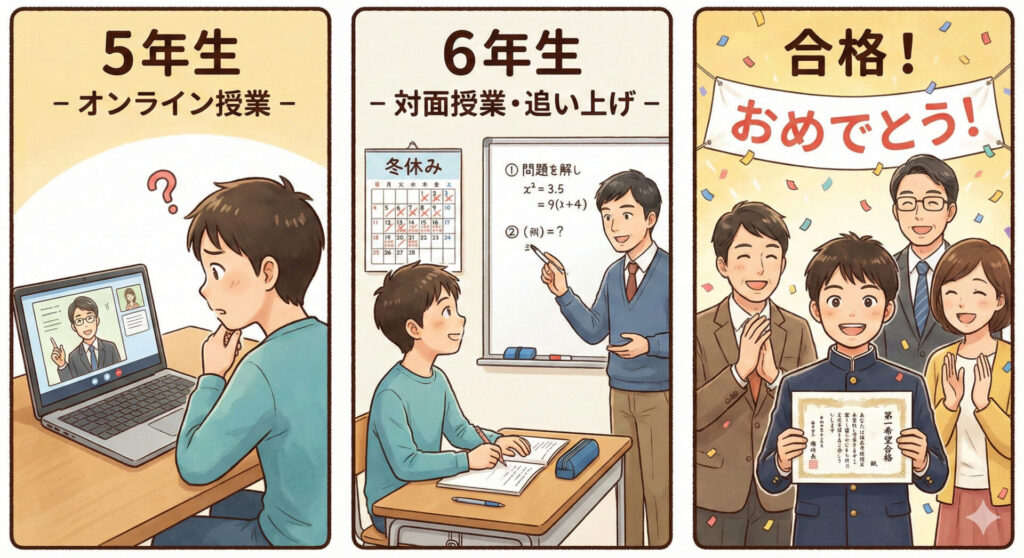5年生はオンライン授業。6年生で対面授業に切り替え、塾長と面談しながら方向性を決めていきつつ手厚いサポートと子供の努力により、無事第一希望に合格する事ができました!(ちなみに我が子はとても勉強が苦手です)